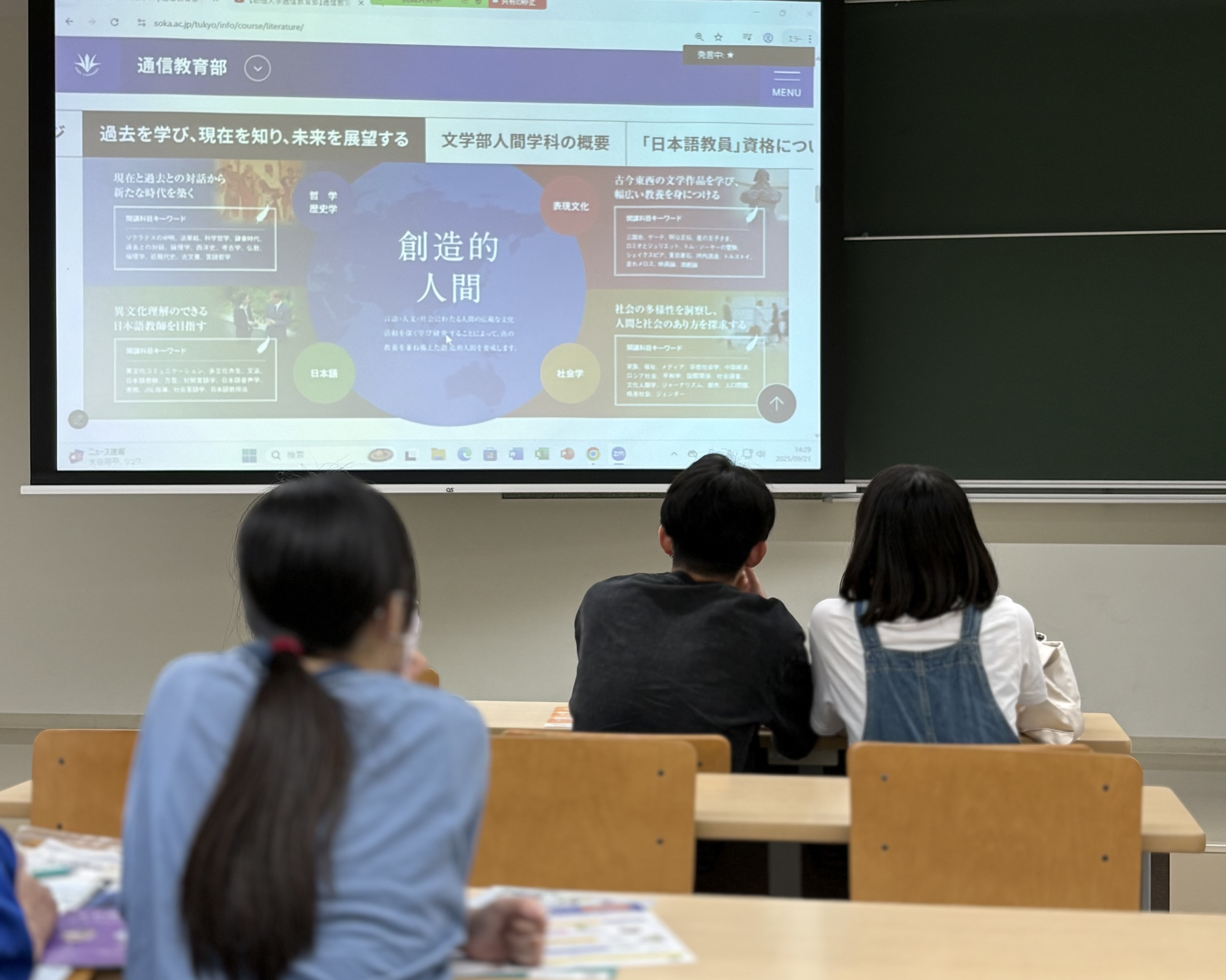 その他にも、通信教育部職員による「創大通教の魅力と概要」の説明や、現役通教生による「学びの体験発表」が行われました。