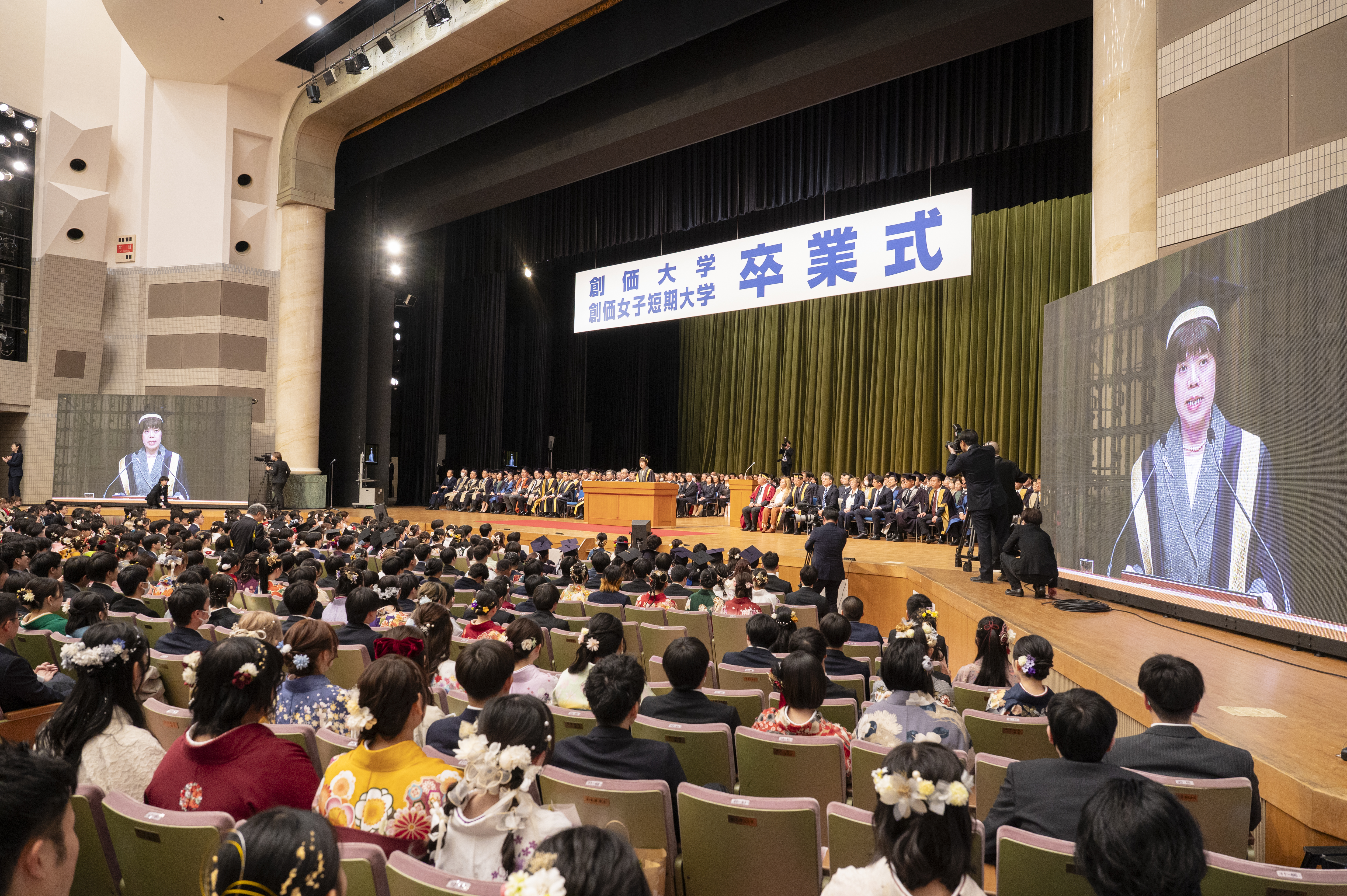 鈴木学長は挨拶の中で、価値創造の歩みを貫いた卒業生を称賛。創立者池田大作先生が2022年4月の入学式で贈られた「艱難をも飛翔の力に」との指針を紹介しました。混迷する世界情勢に触れつつ、「あきらめない『勇気』こそが『創価』の異名」と述べ、「いかなる嵐にも屈せず、『希望』と『勝利』の人生を歩んでいただきたい」とエールを贈りました。